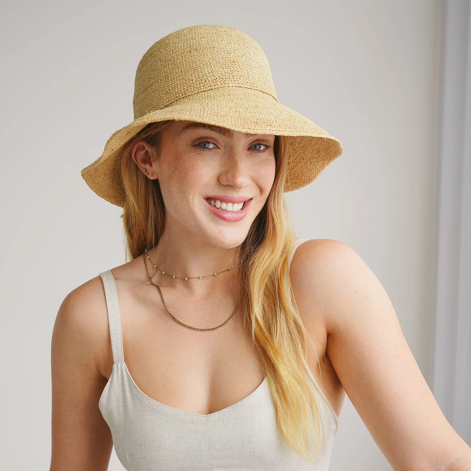 A finely woven raffia cloche hat featuring a practical, rollable design. Made from sustainably harvested raffia from Madagascar, this beautiful raffia hat offers the perfect blend of natural charm and timeless elegance. As one of our most versatile sun hats for women, it is exceptionally lightweight and breathable. Its rollable nature makes it the ultimate travel companion, easily fitting into your holiday luggage while providing excellent shade and reliable UV protection for your face and neck. Step out in style with this effortlessly chic summer essential.